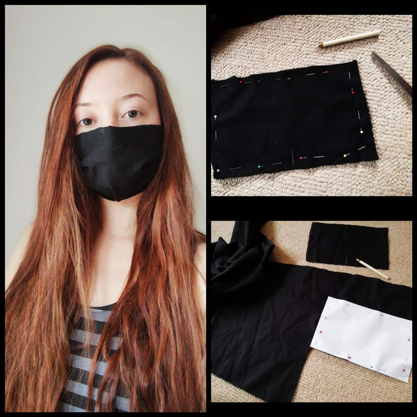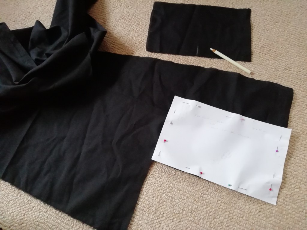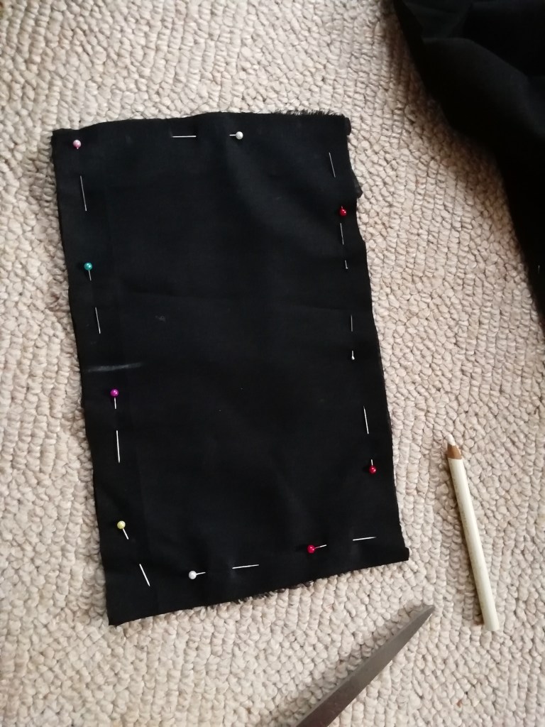 I took her suggested measurements and created a rectangle pattern. I then cut four pieces of black cotton to the pattern. I had some spare cotton lying around from a previous project I did a few years ago. The weave was not very tight hence why I chose to make four layers for the mask. This would make the face covering more effective, and therefore safer.