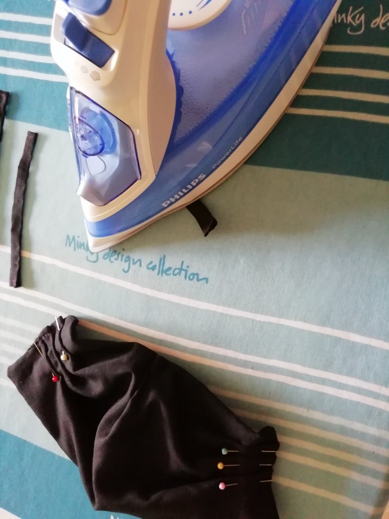 It was all going fairly well, I chose to hand sew the material as I enjoy hand sewing but using a machine would be significantly faster! Hand sewing did provide greater control over the darts though. I placed one dart under the chin so the material wraps around my face closely, and added some pleats at each side to give a snug fit. I then decided to be artistic and make life harder for myself by creating my own straps out of matching material. Elastic would have worked just fine!