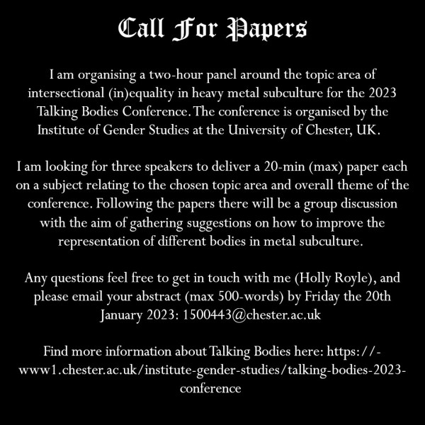 I am organising a two-hour panel around the topic area of intersectional (in)equality in heavy metal subculture for the 2023 Talking Bodies Conference (12th-16th June). The conference is organised by the Institute of Gender Studies, University of Chester, UK.